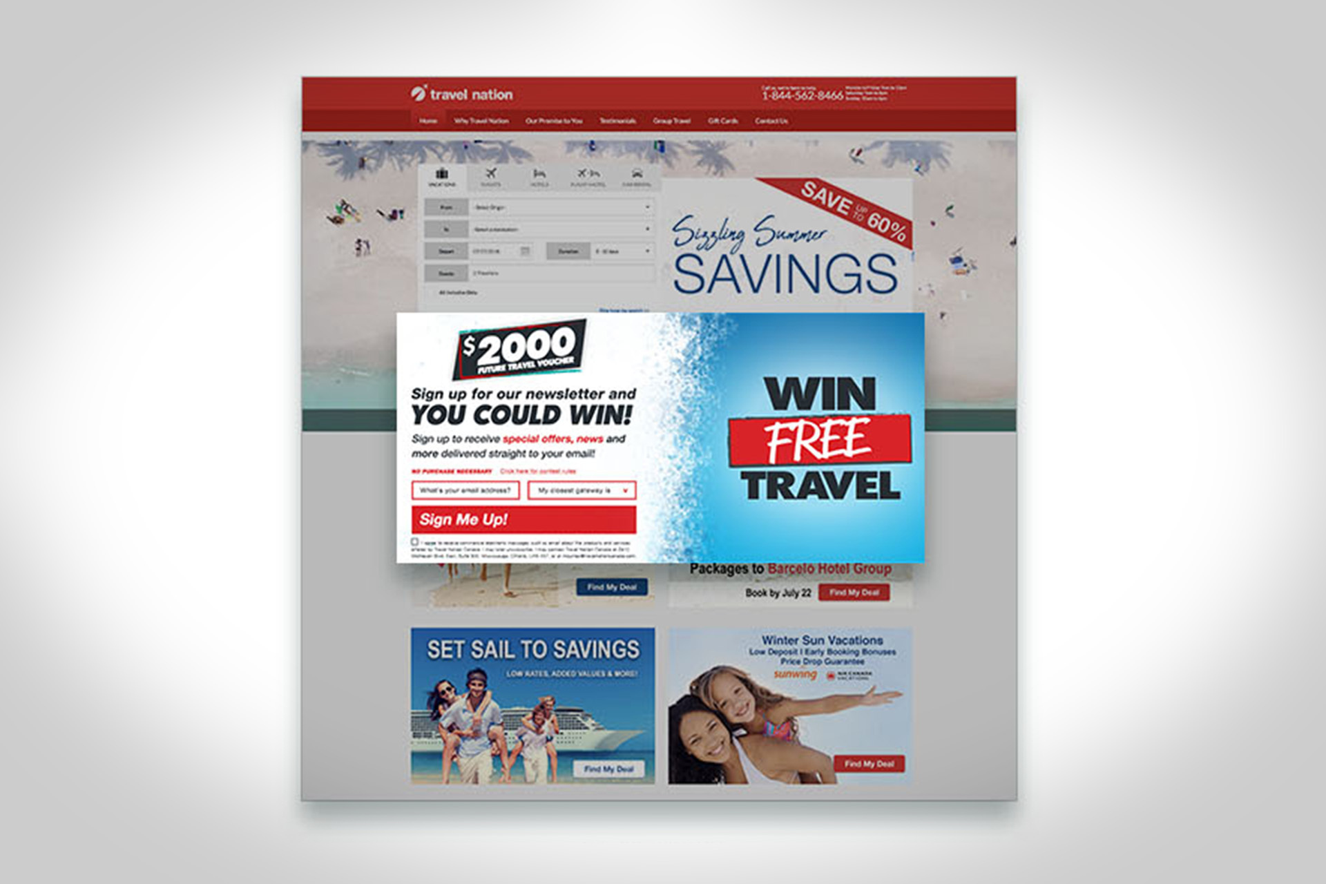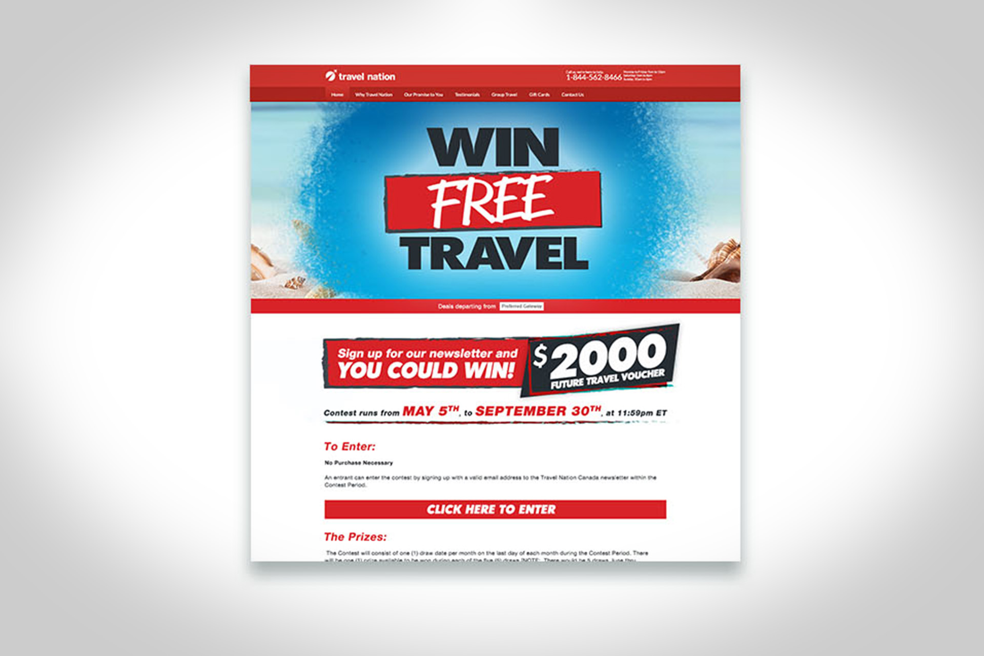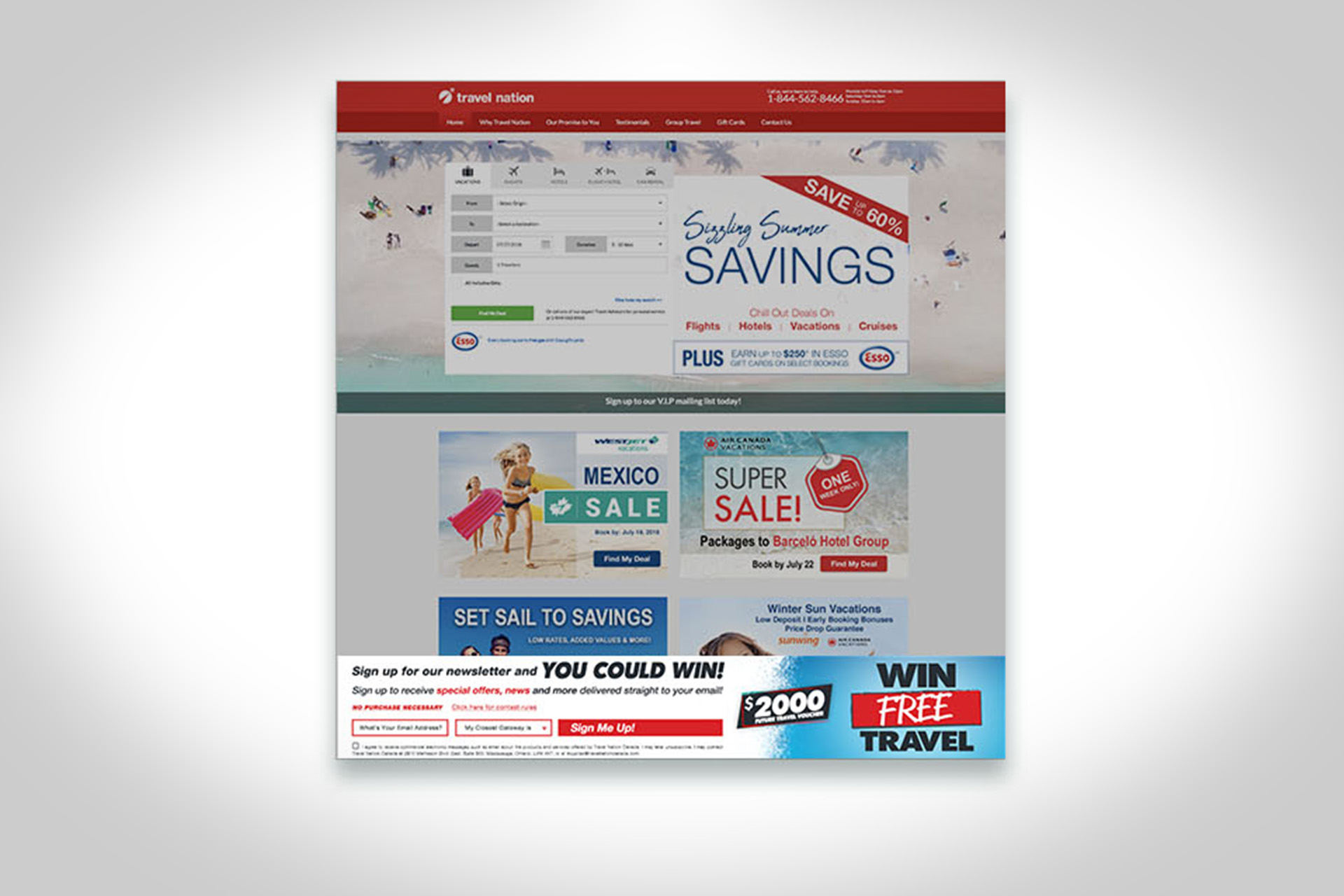 Travel Nation is a full service travel agency providing all-inclusive vacations, flights, hotels, rental cars and cruises. Travel nation is based out of Mississauga Ontario. I worked with Travel Nation for a year creating online web ads, email newsletters, promotional landing pages and short animations.
